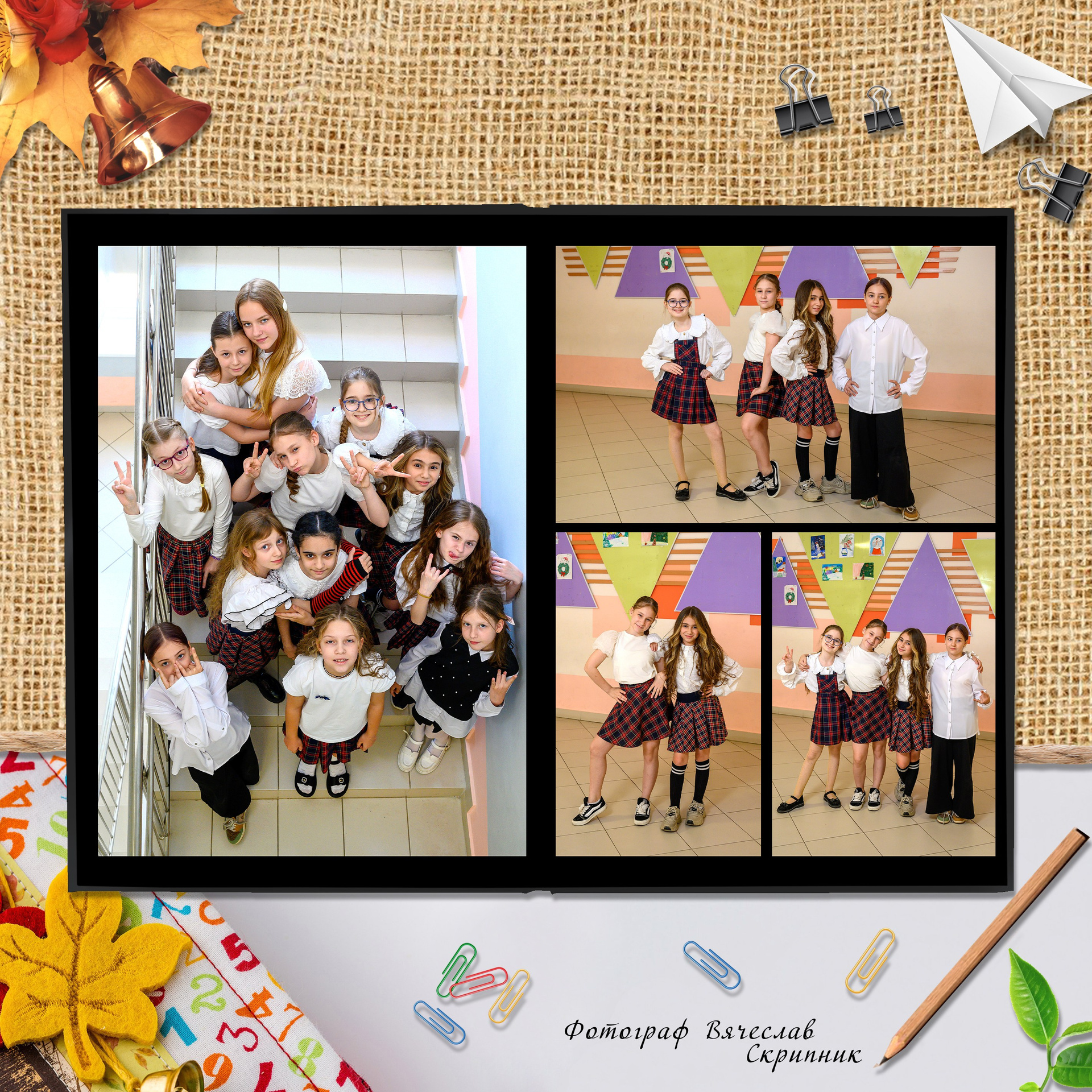 - первый разворот: виньетка класса с подписанными именами и фамилиями