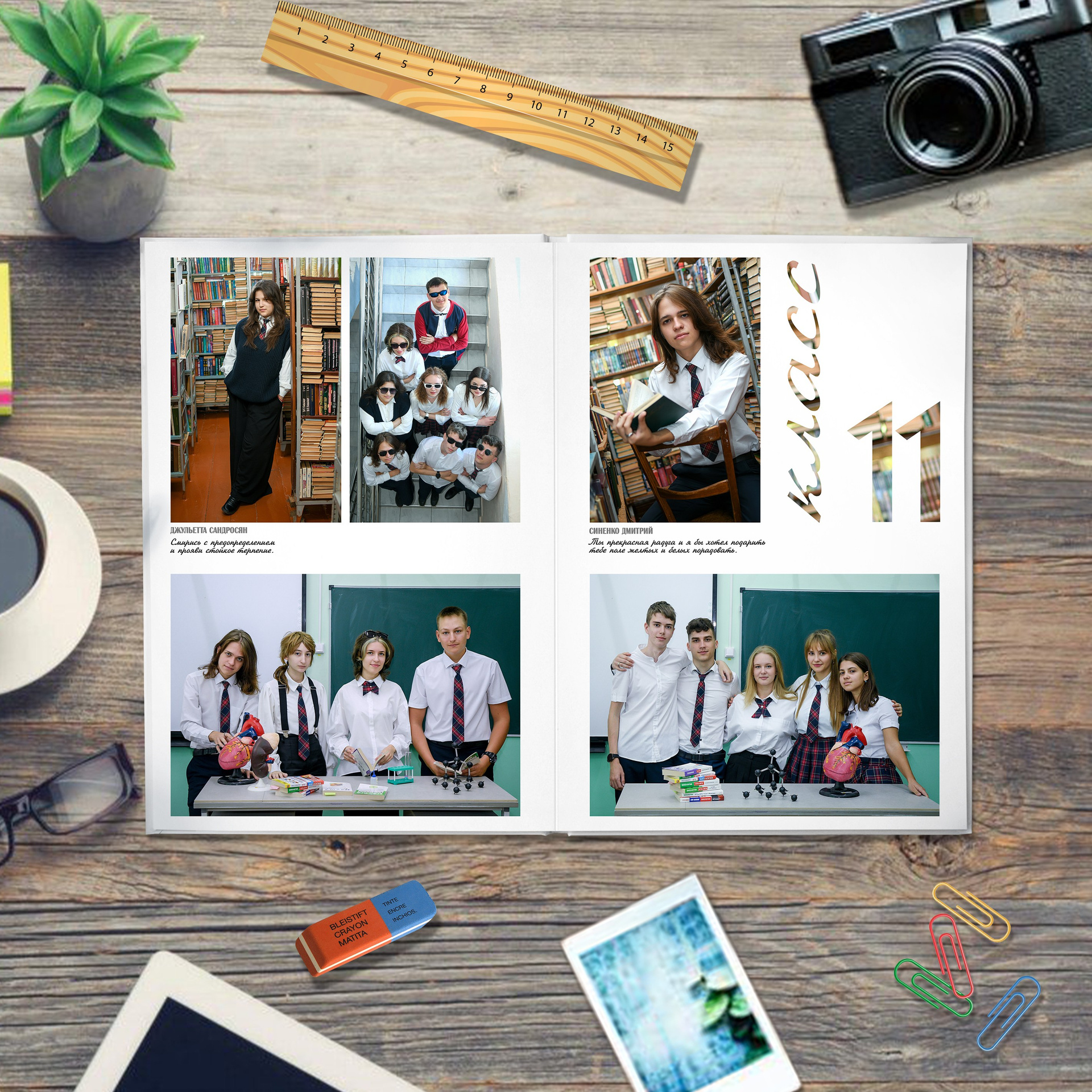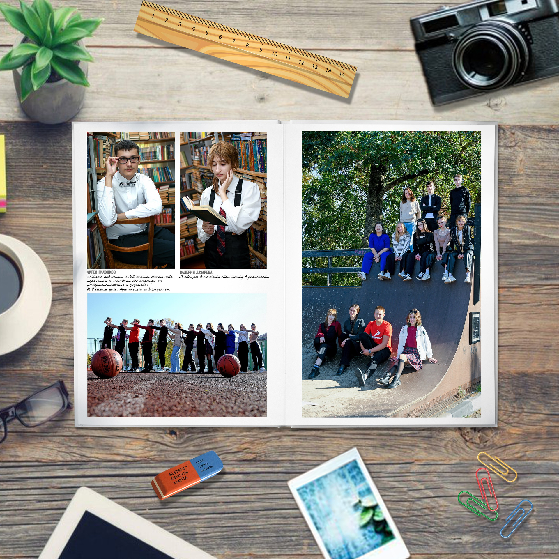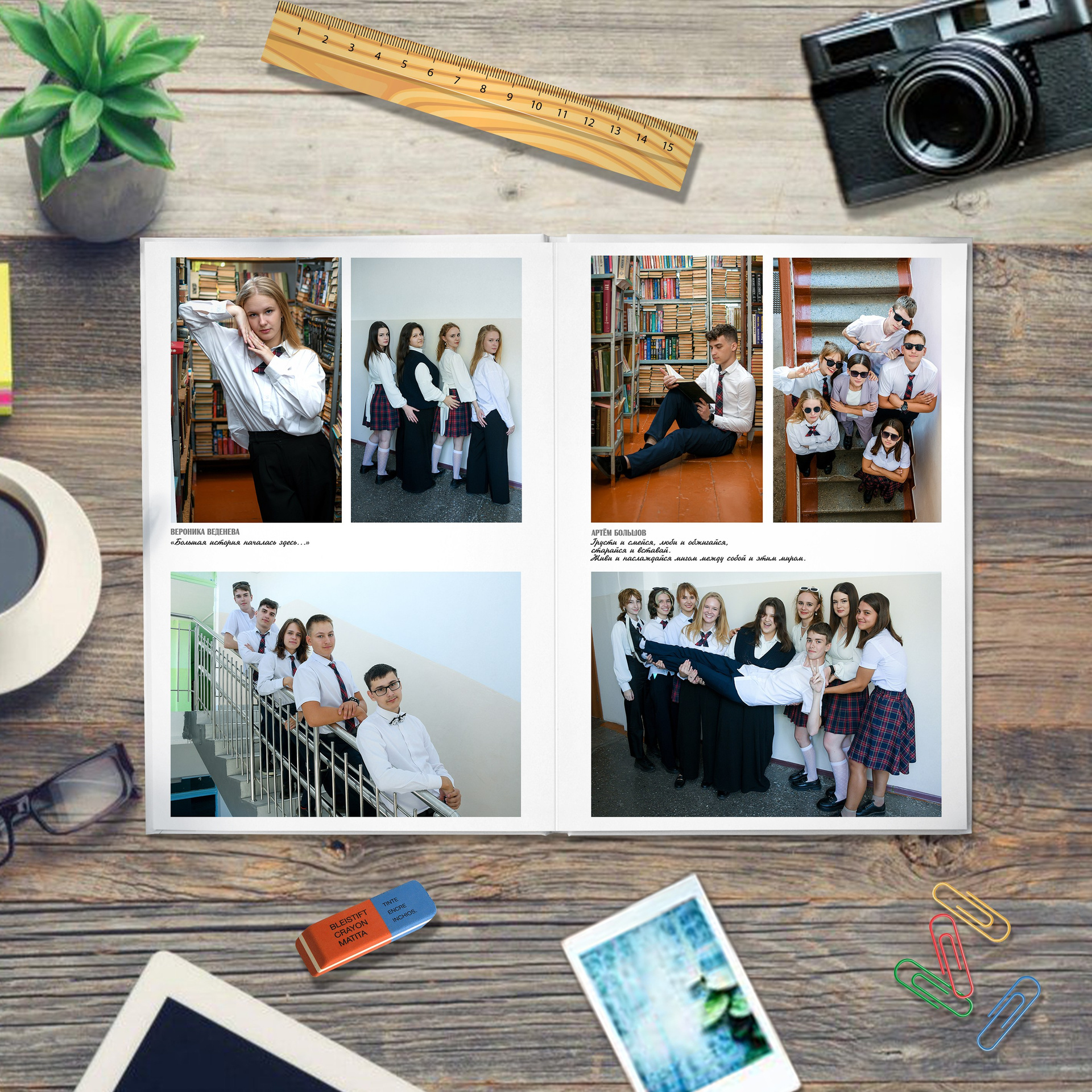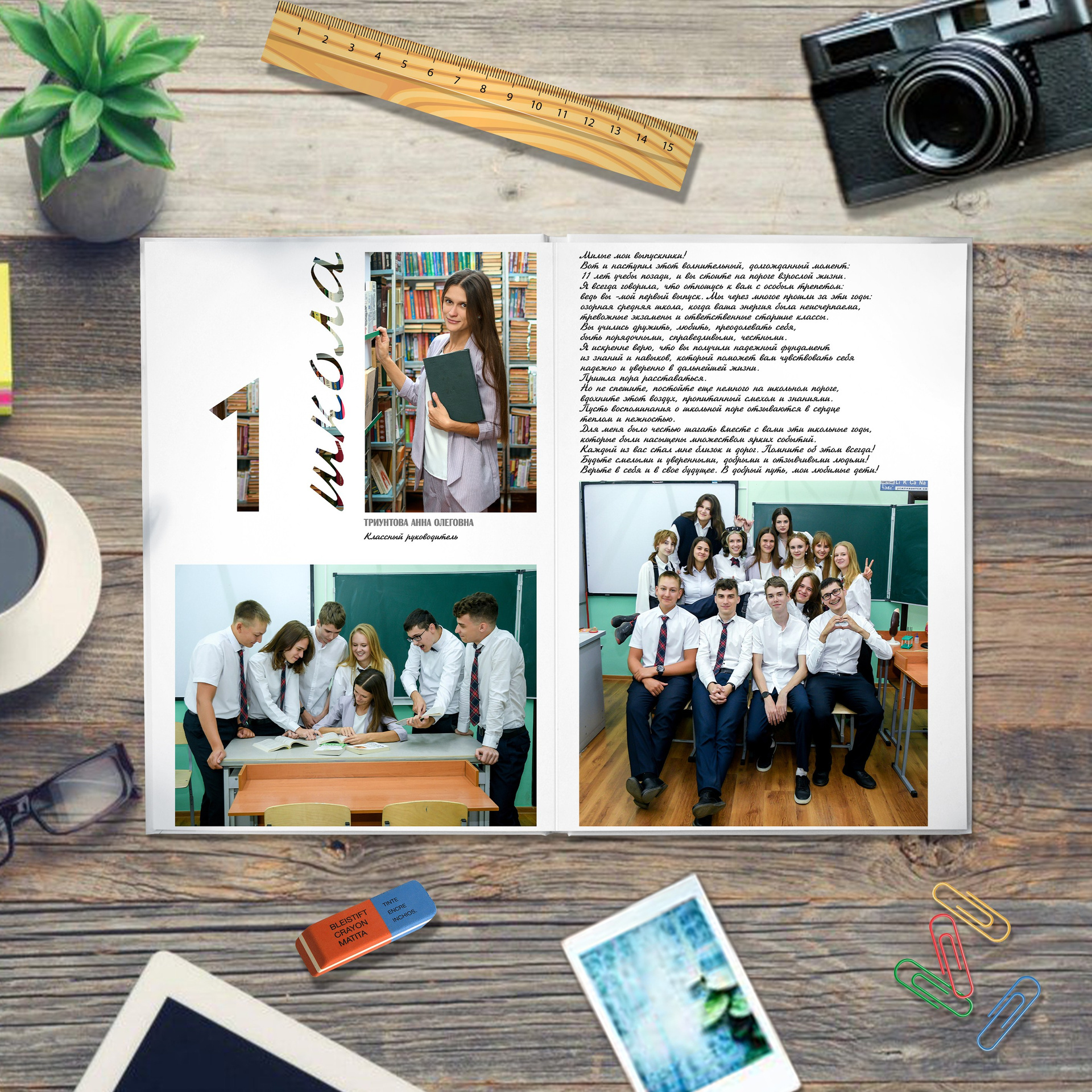 - первый разворот: портрет классного руководителя с пожеланиями выпускникам и две общих фотографии