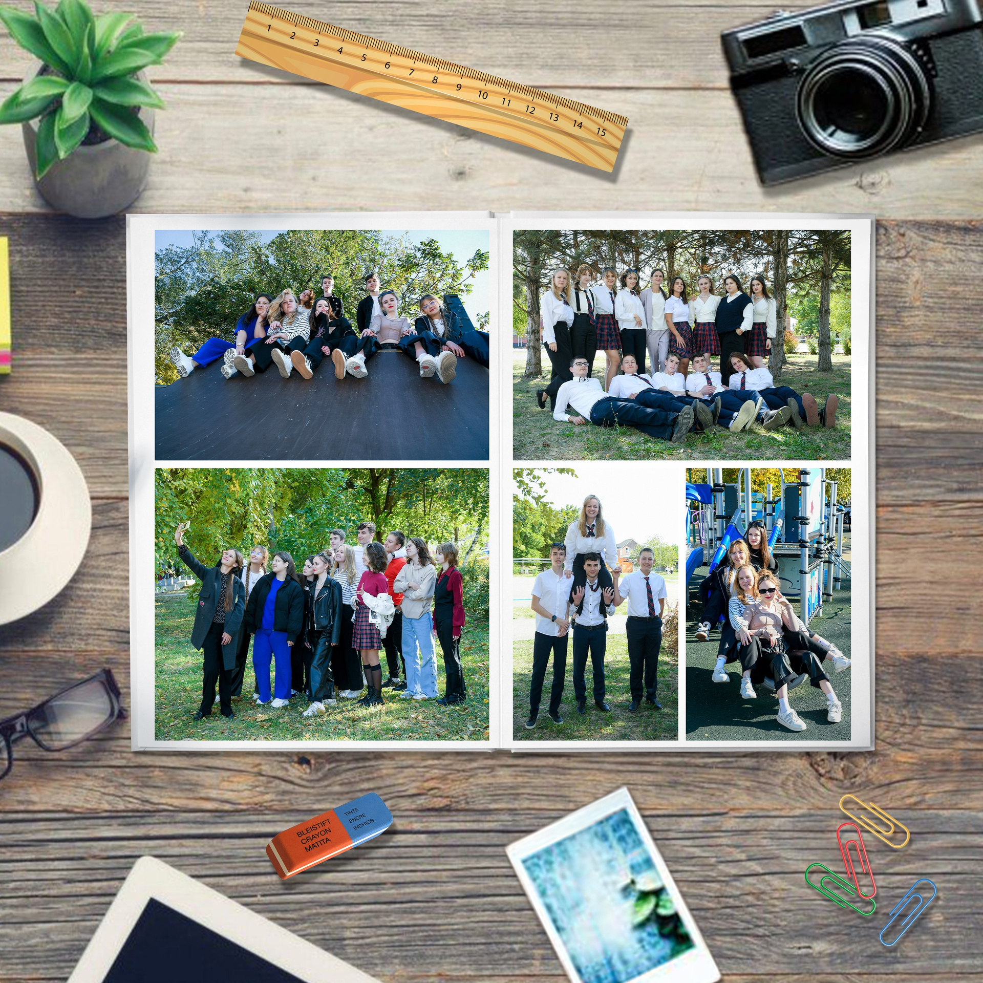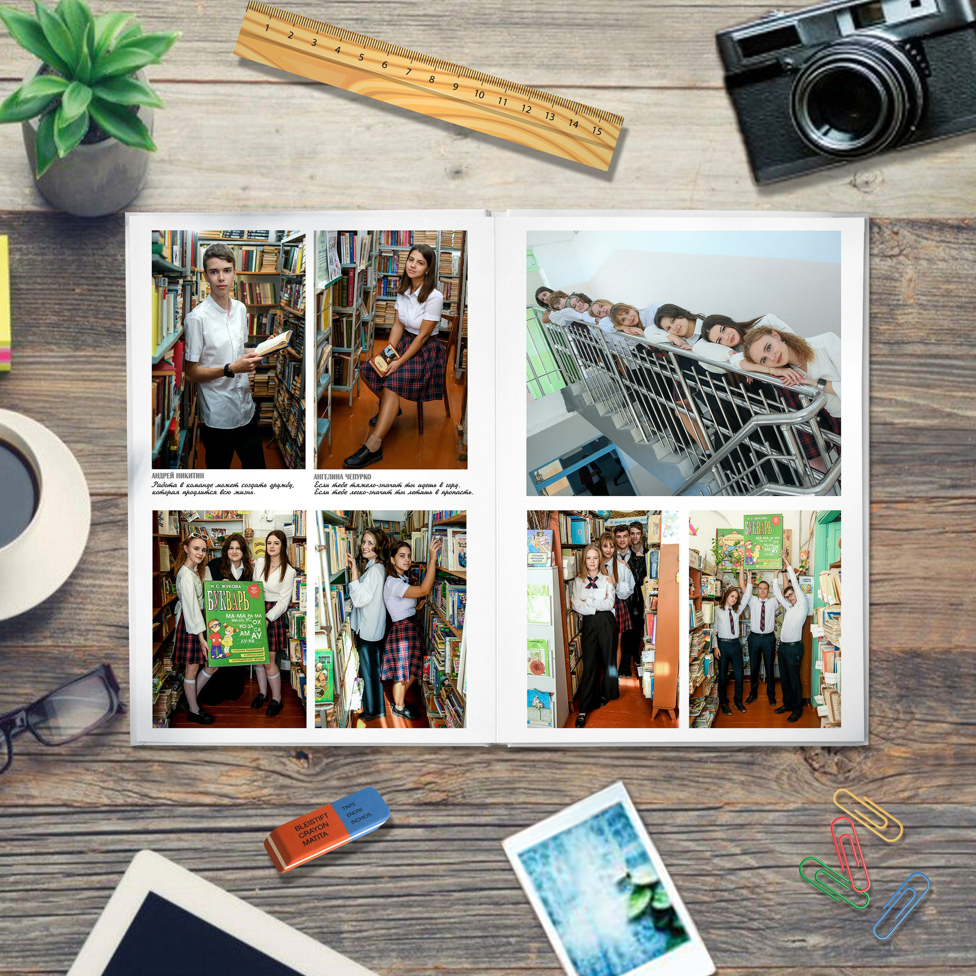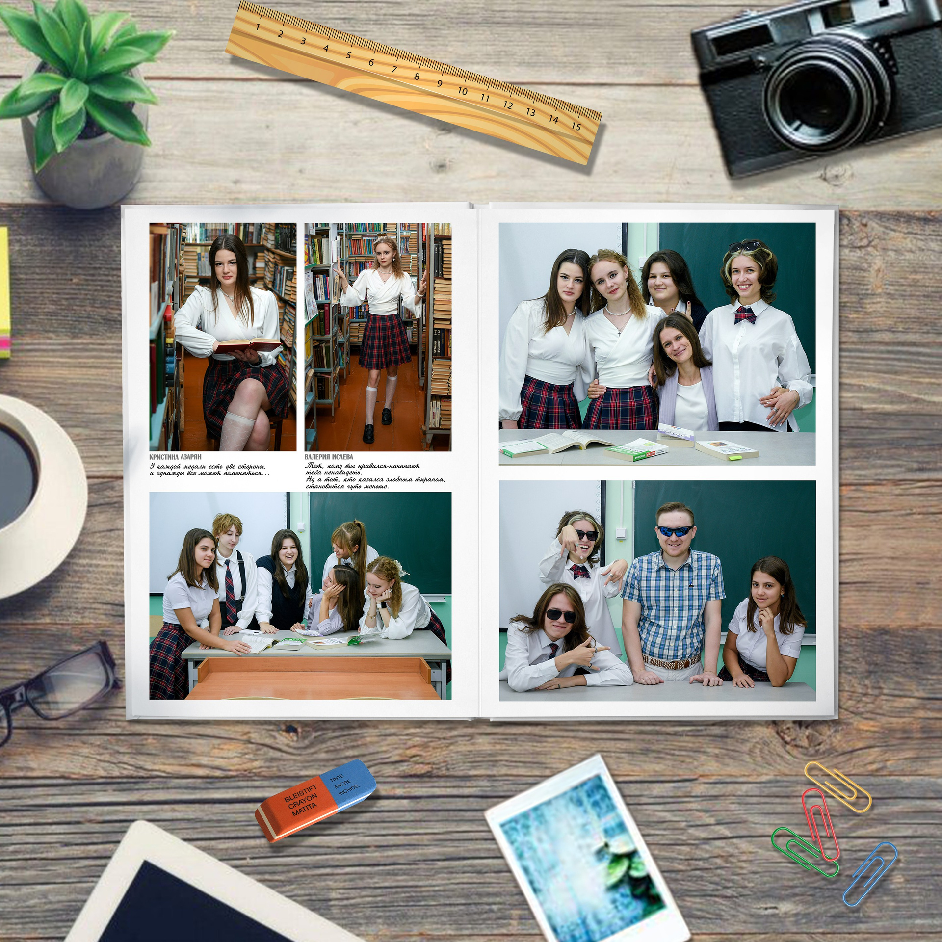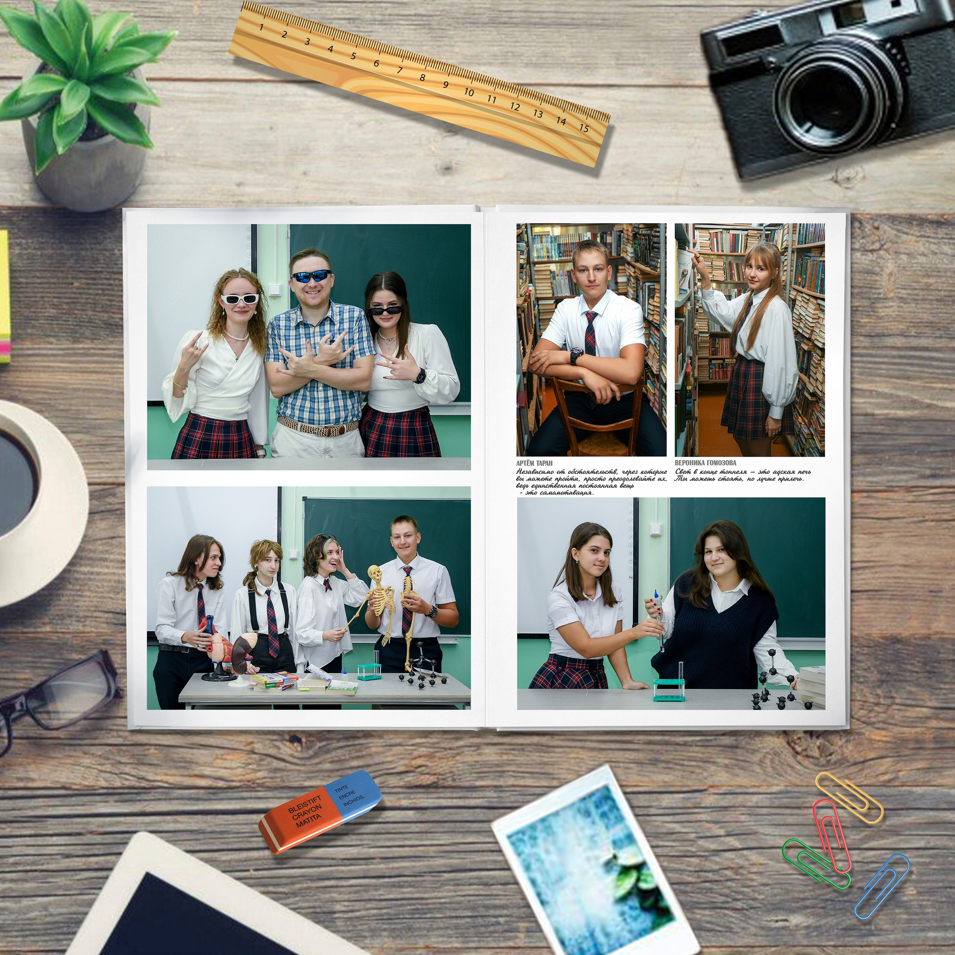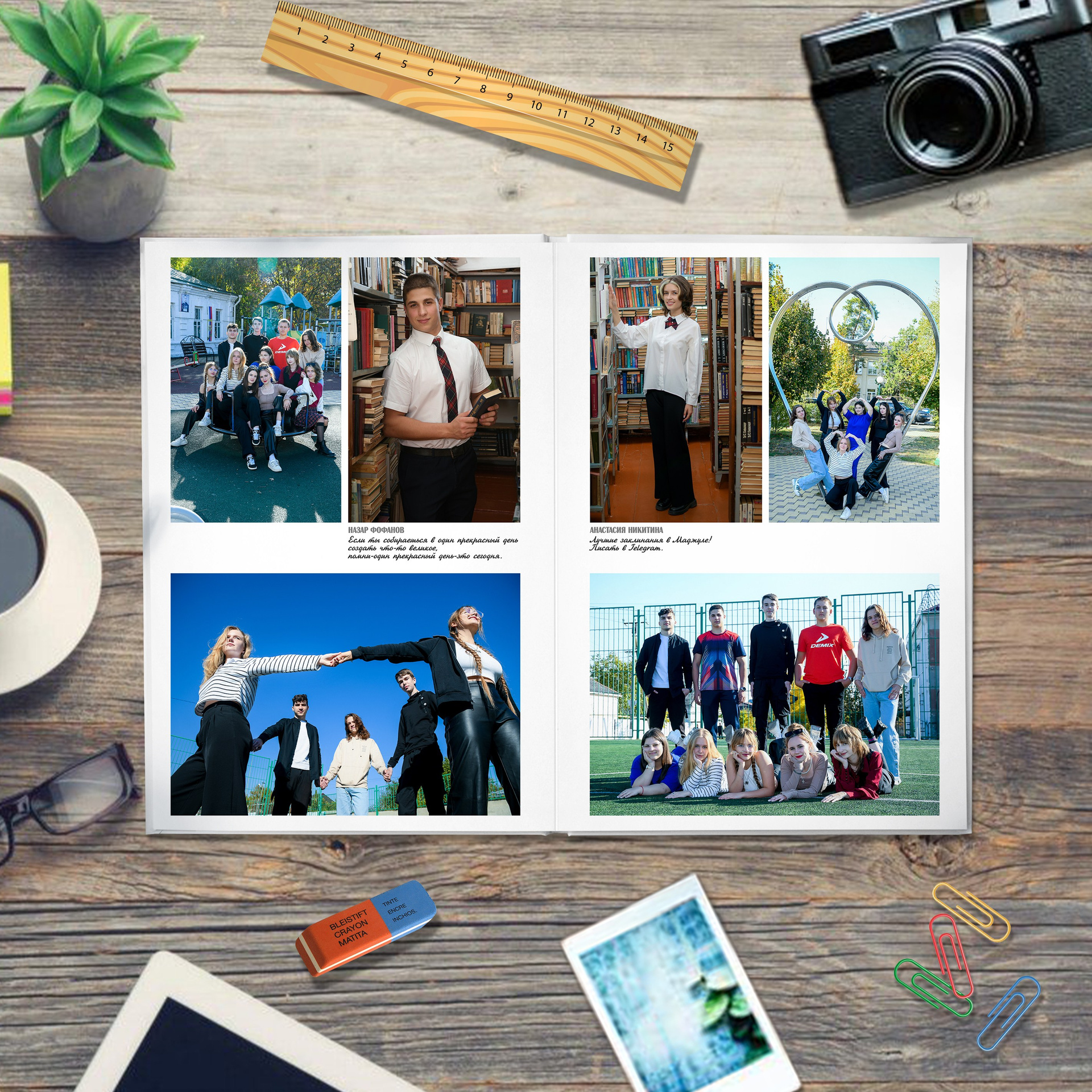 - первый разворот: портрет классного руководителя с пожеланиями выпускникам и две общих фотографии