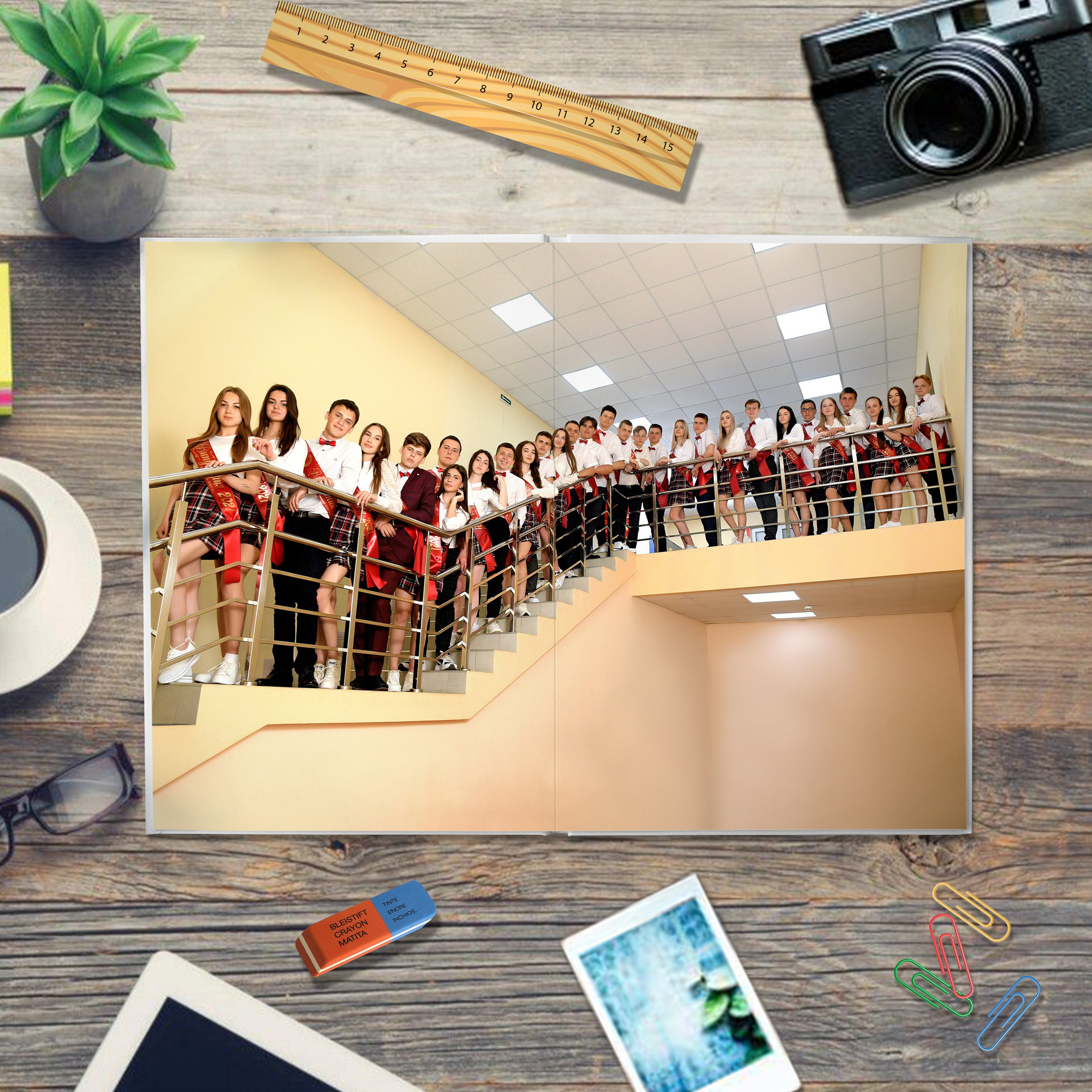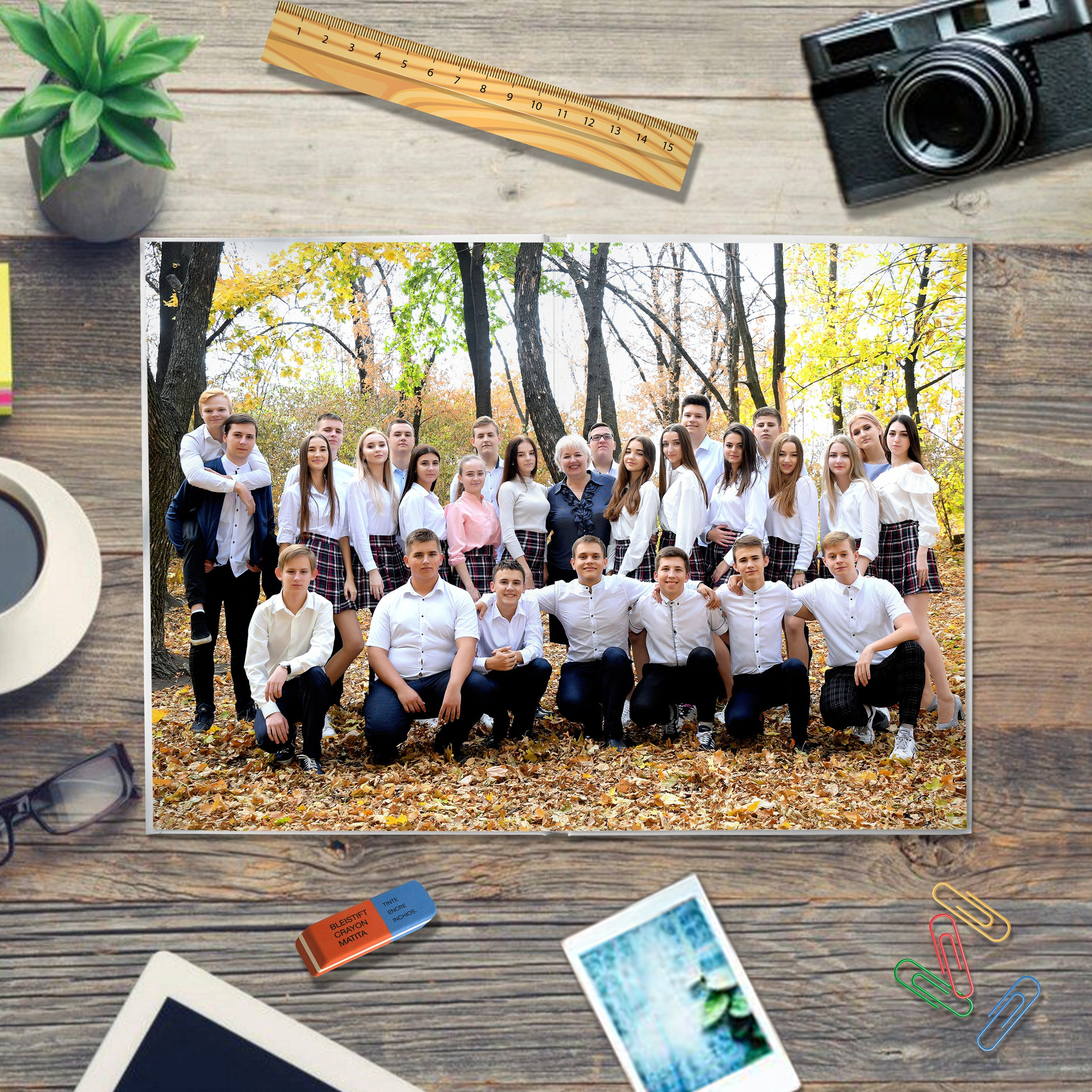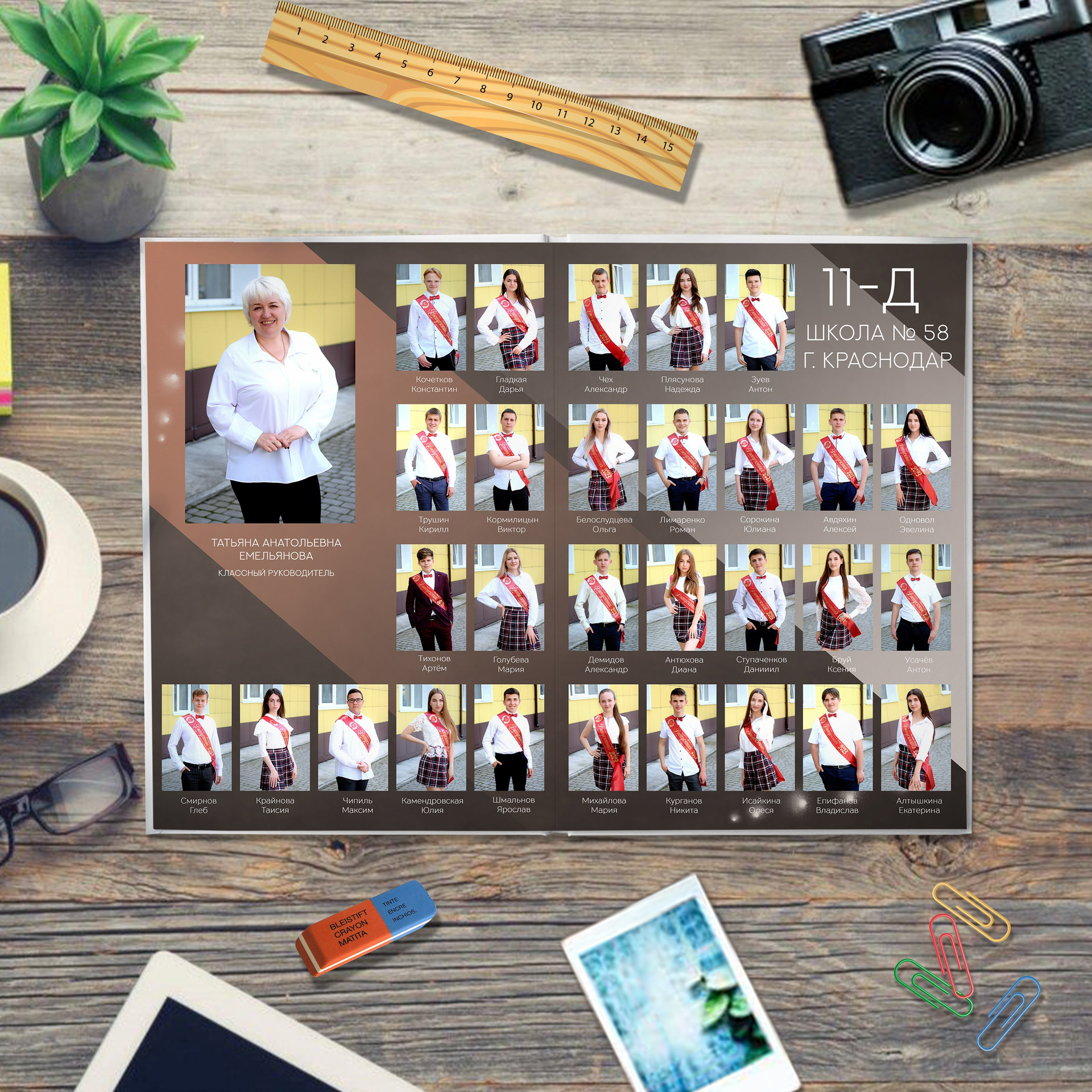 - второй разворот: виньетка класса с подписанными именами и фамилиями
