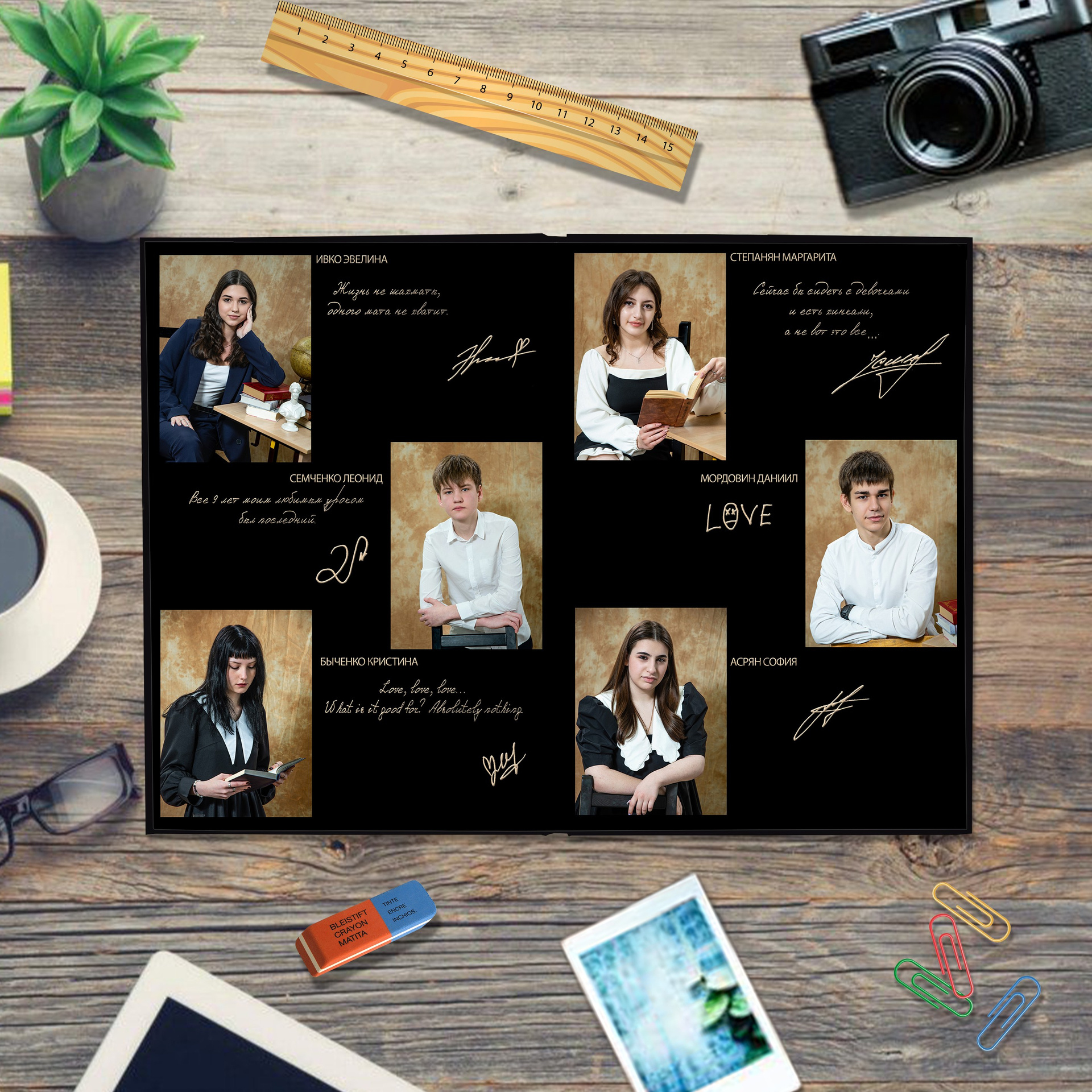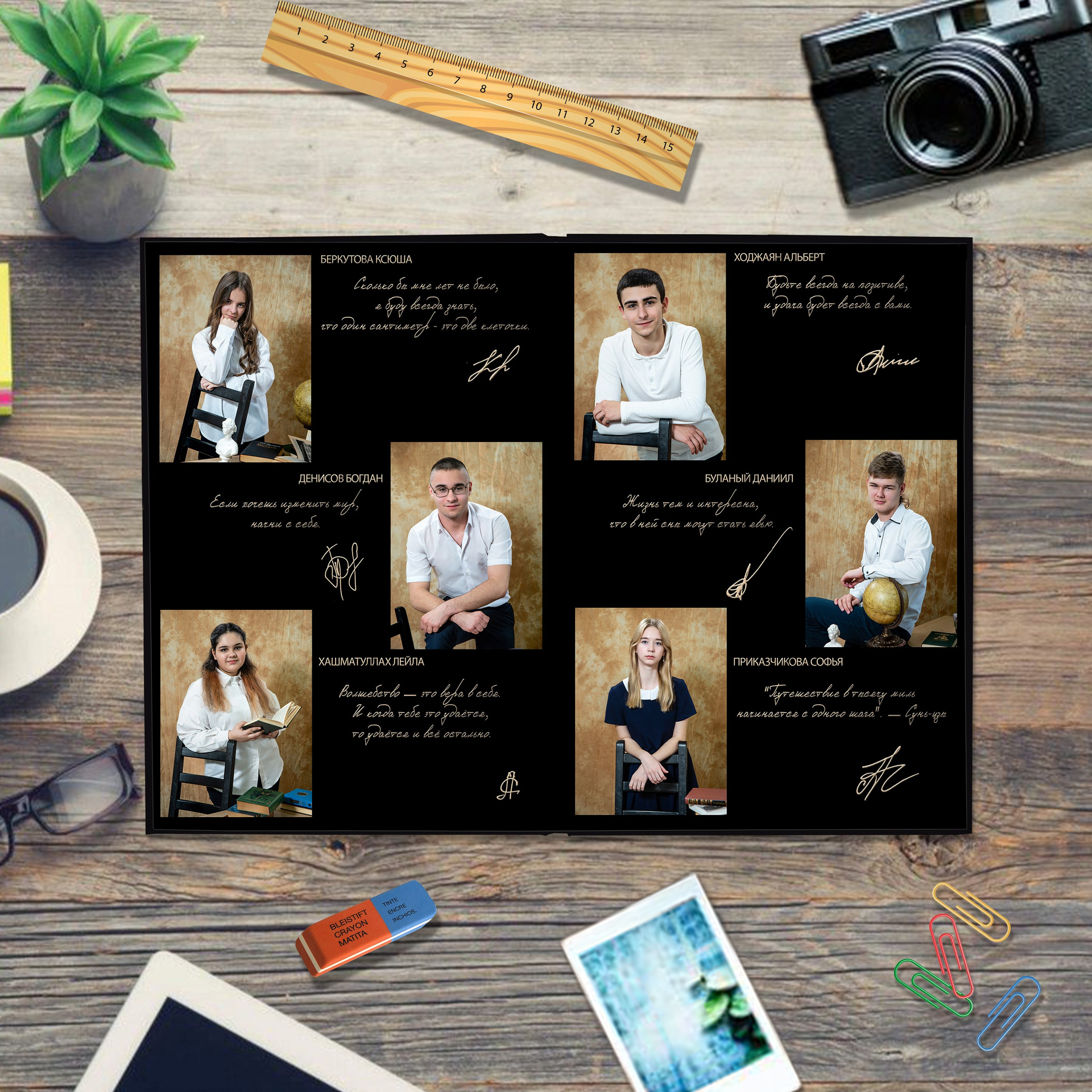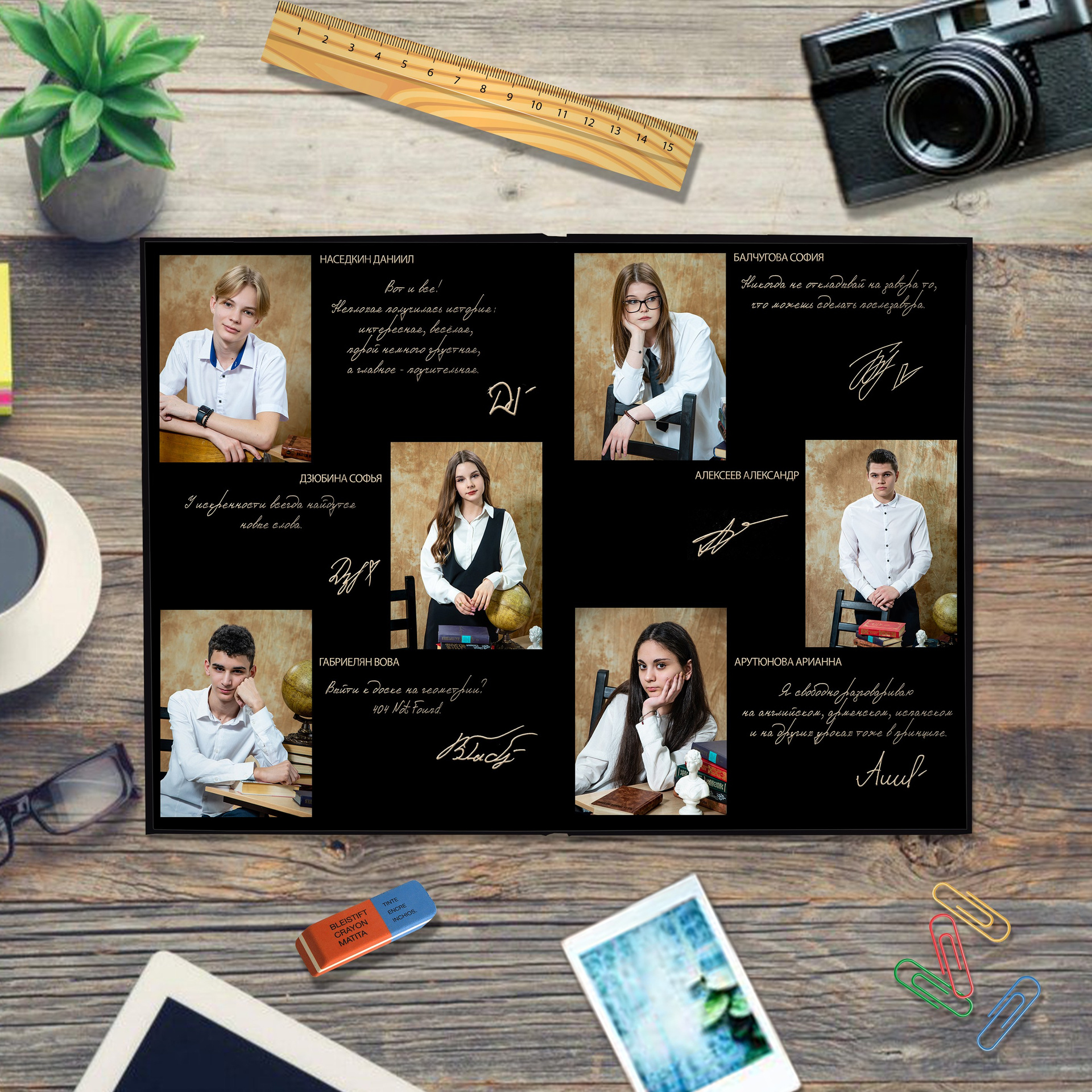 - третий-десятый развороты: виньетка класса с подписанными именами и фамилиями, и цитатами