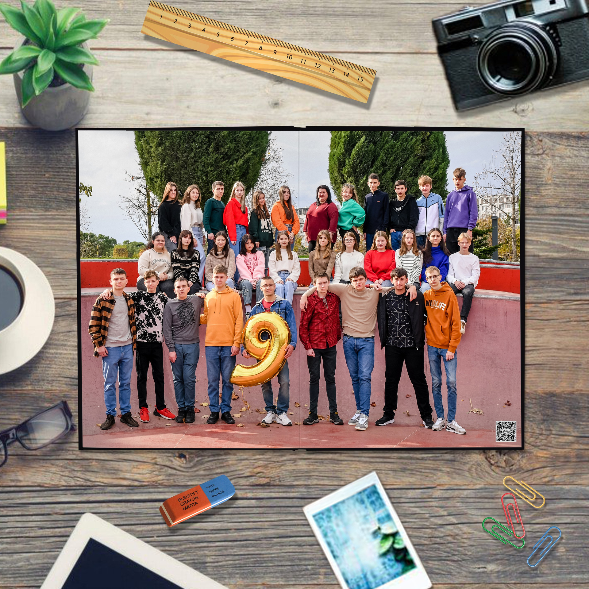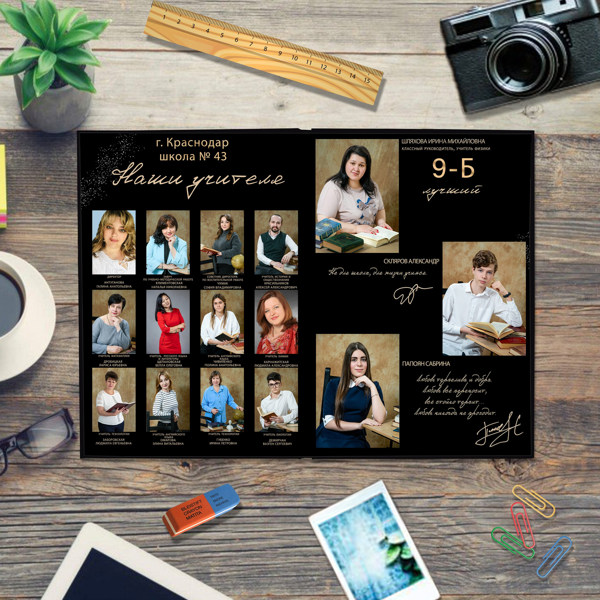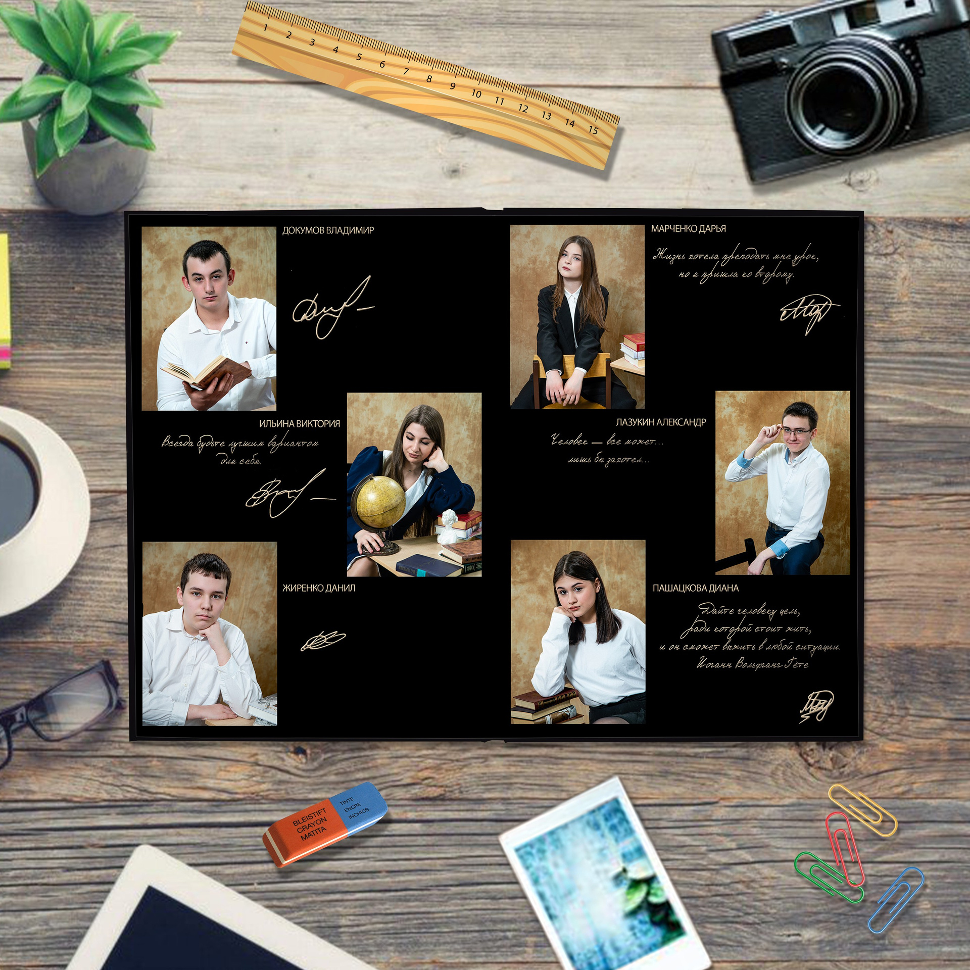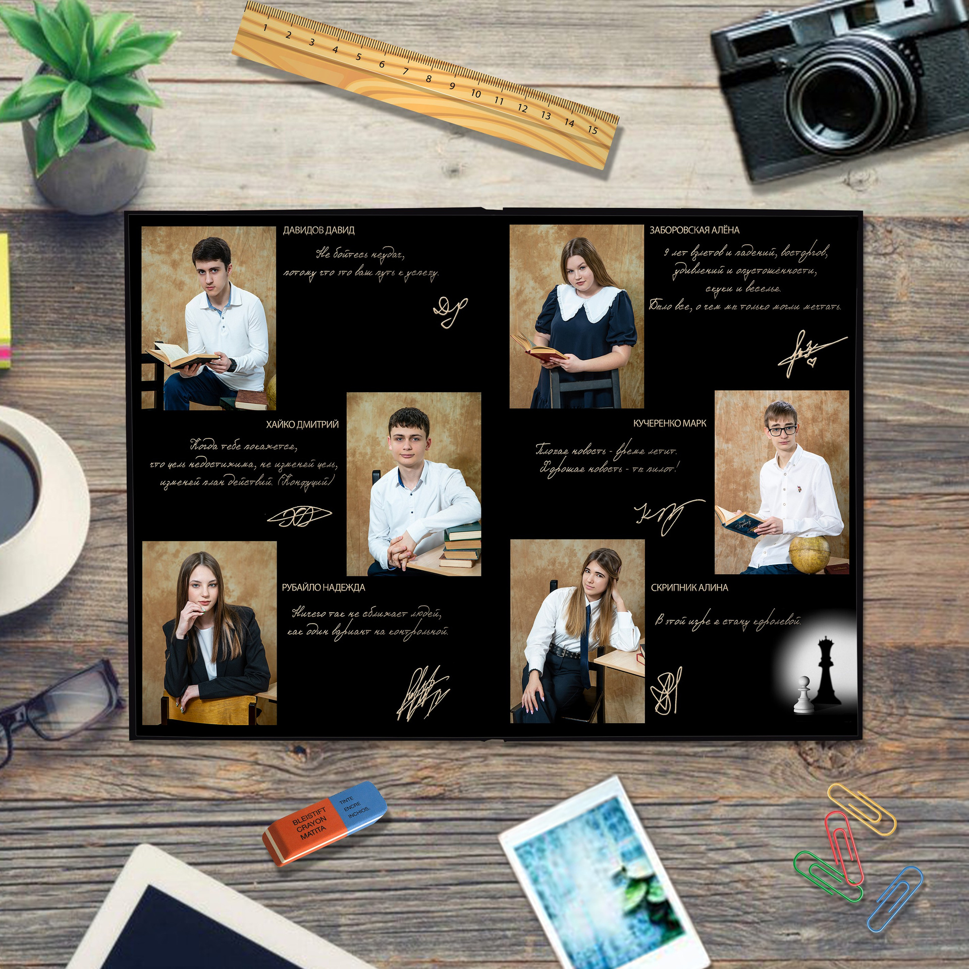 - третий-десятый развороты: виньетка класса с подписанными именами и фамилиями, и цитатами