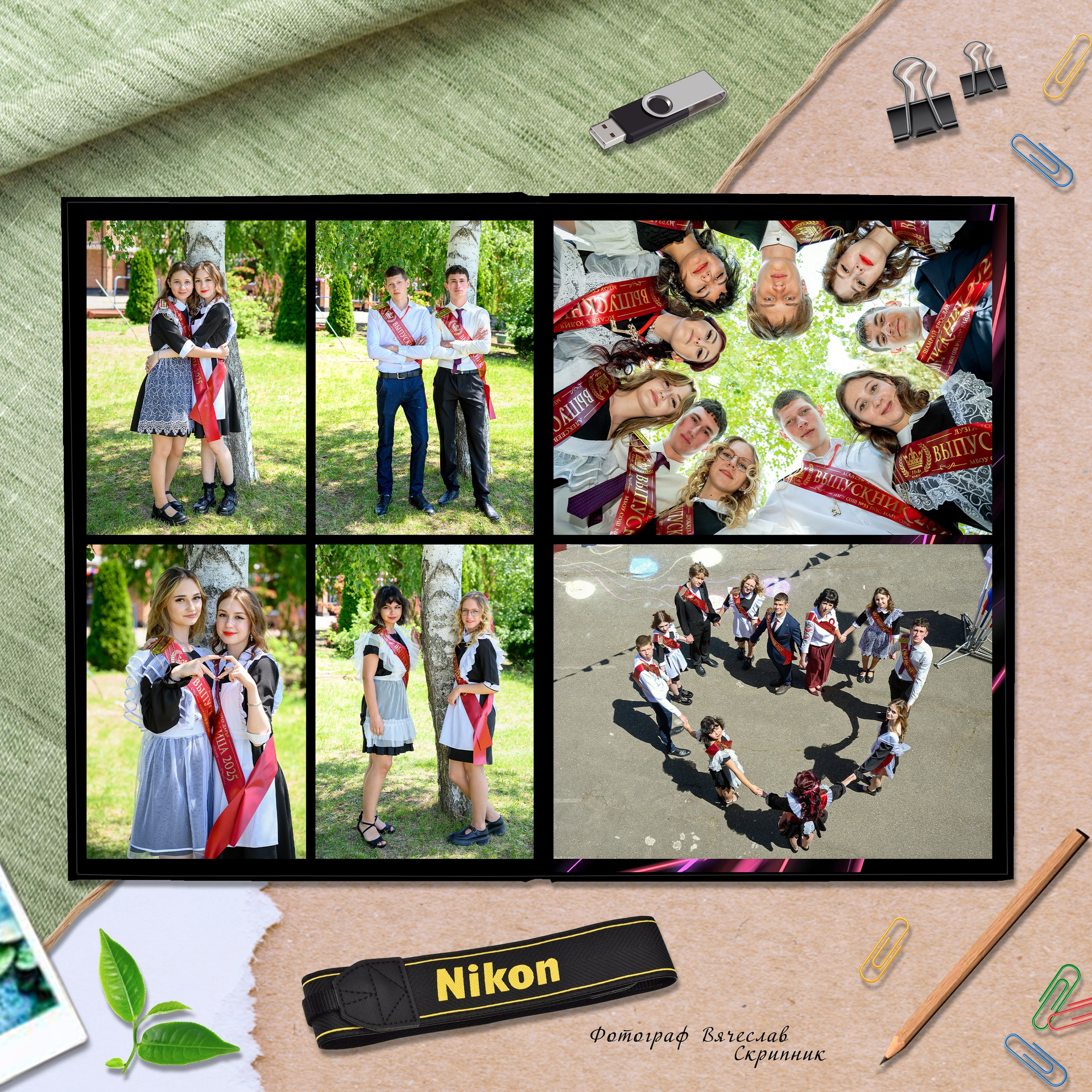 - первый разворот: виньетка класса с подписанными именами и фамилиями