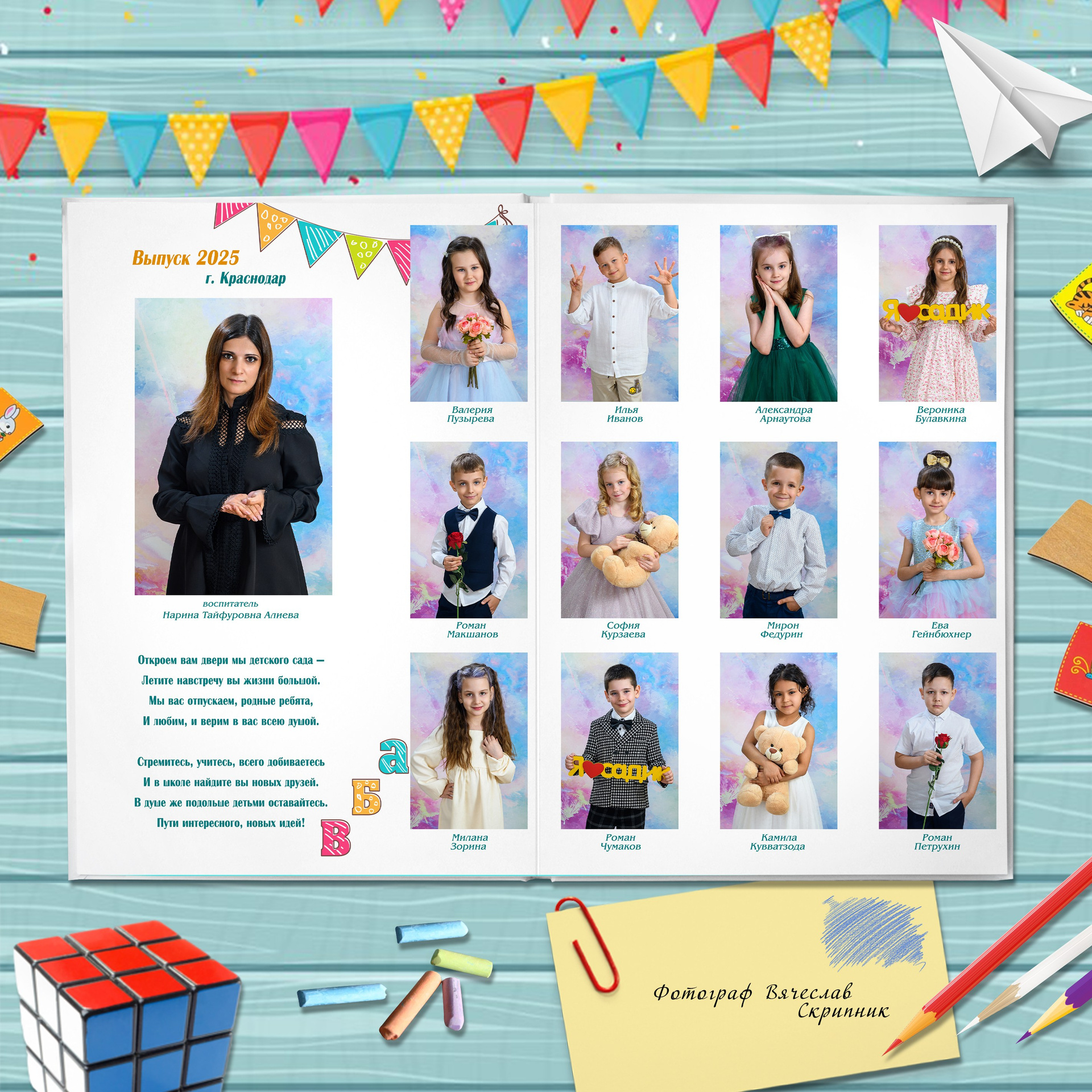 - разворот: виньетка группы с подписанными именами и фамилиями